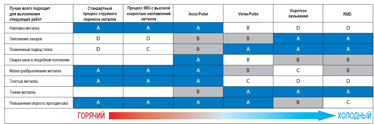 Показатели A, B, C и D являются относительными значениями. Показатель A указывает на лучшее сочетание между требованиями к производительности и технологическим процессом. Пустое поле указывает на то, что данный процесс не рекомендуется к применению в рассматриваемом случае.